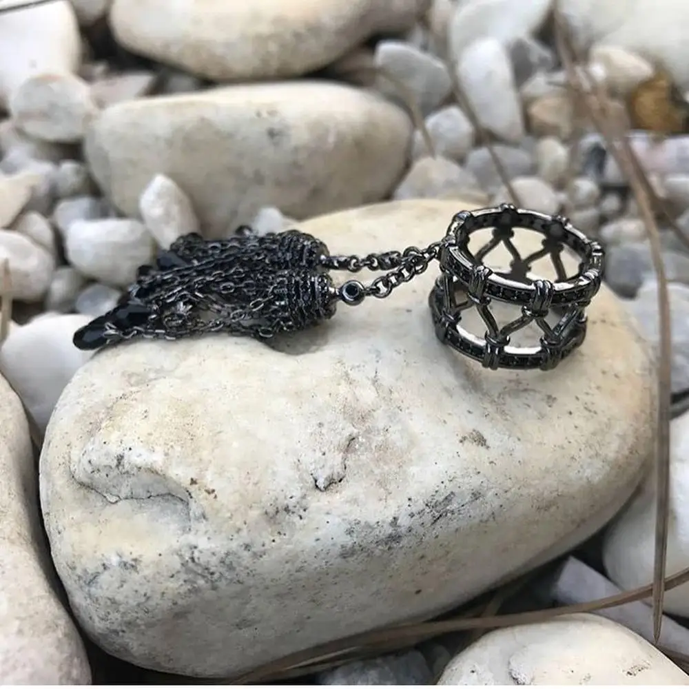 Discount 925 Sterling Silver Rings for Women with Double Tassel Rings with Crystal droplets White and Black