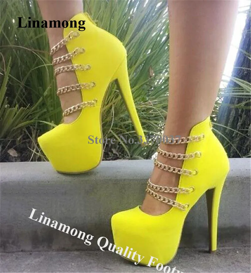 Sale Linamong Charming Round Toe Suede Leather High Platform Gold Chains Cross Stiletto Heel Pumps Super