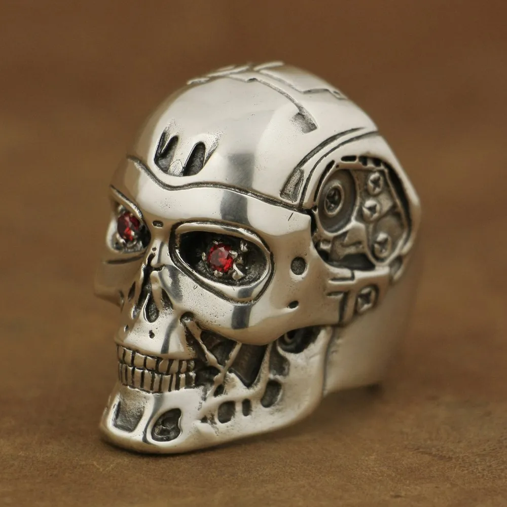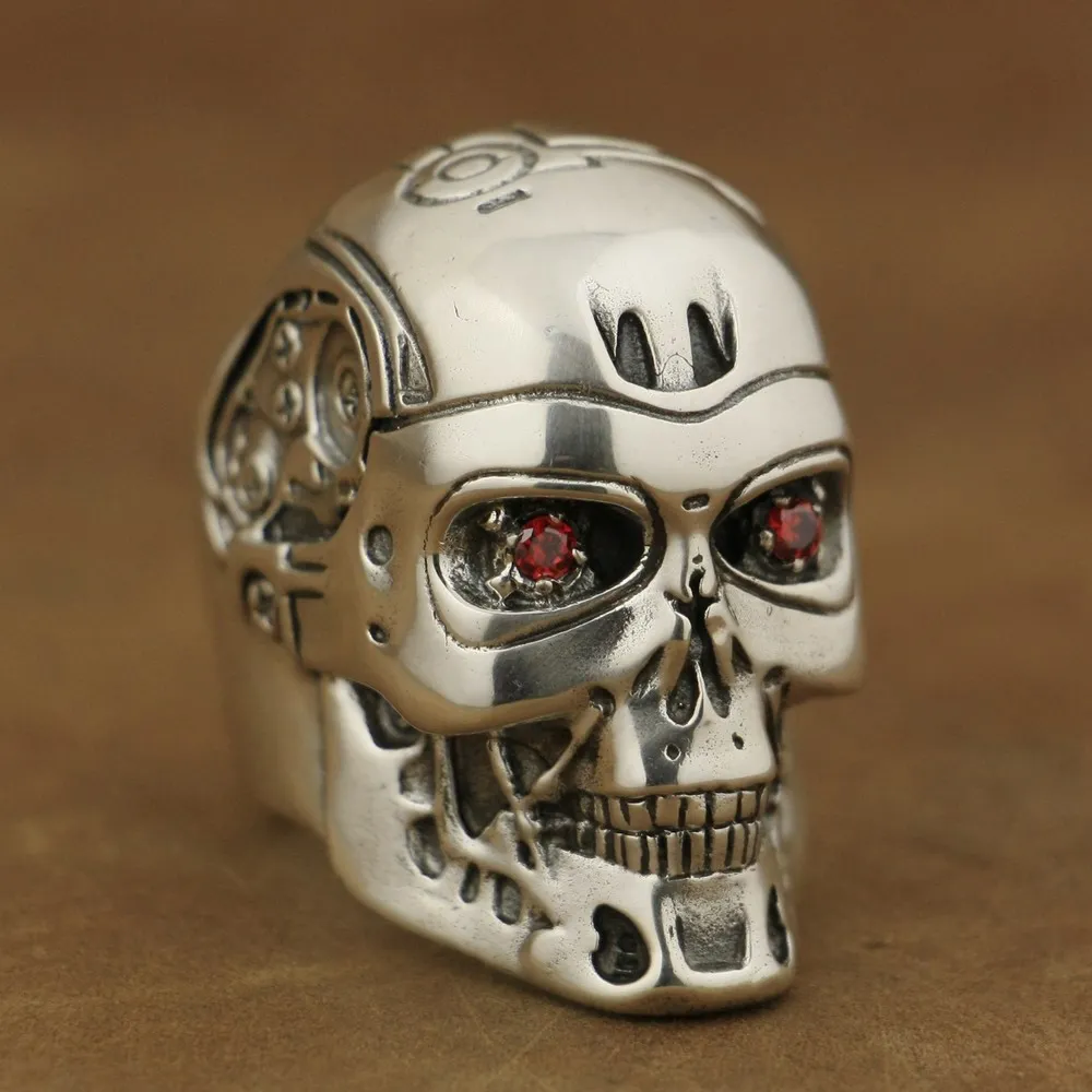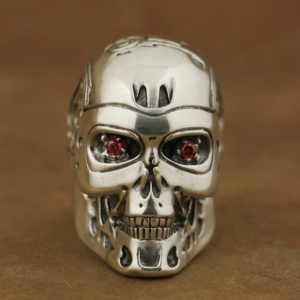 NEW LINSION Handmade 925 Sterling Silver Red CZ Eyes Terminator Mens Biker Robot Ring TA80